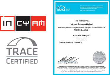 inCyam Co. Ltd., an in-group of BE Petrothai Group, a business of distribution and import oil and gas and petrochemical industry machines, has been certified by Trace International organization of being an international anti-bribery standard and transparency in international commercial transactions.