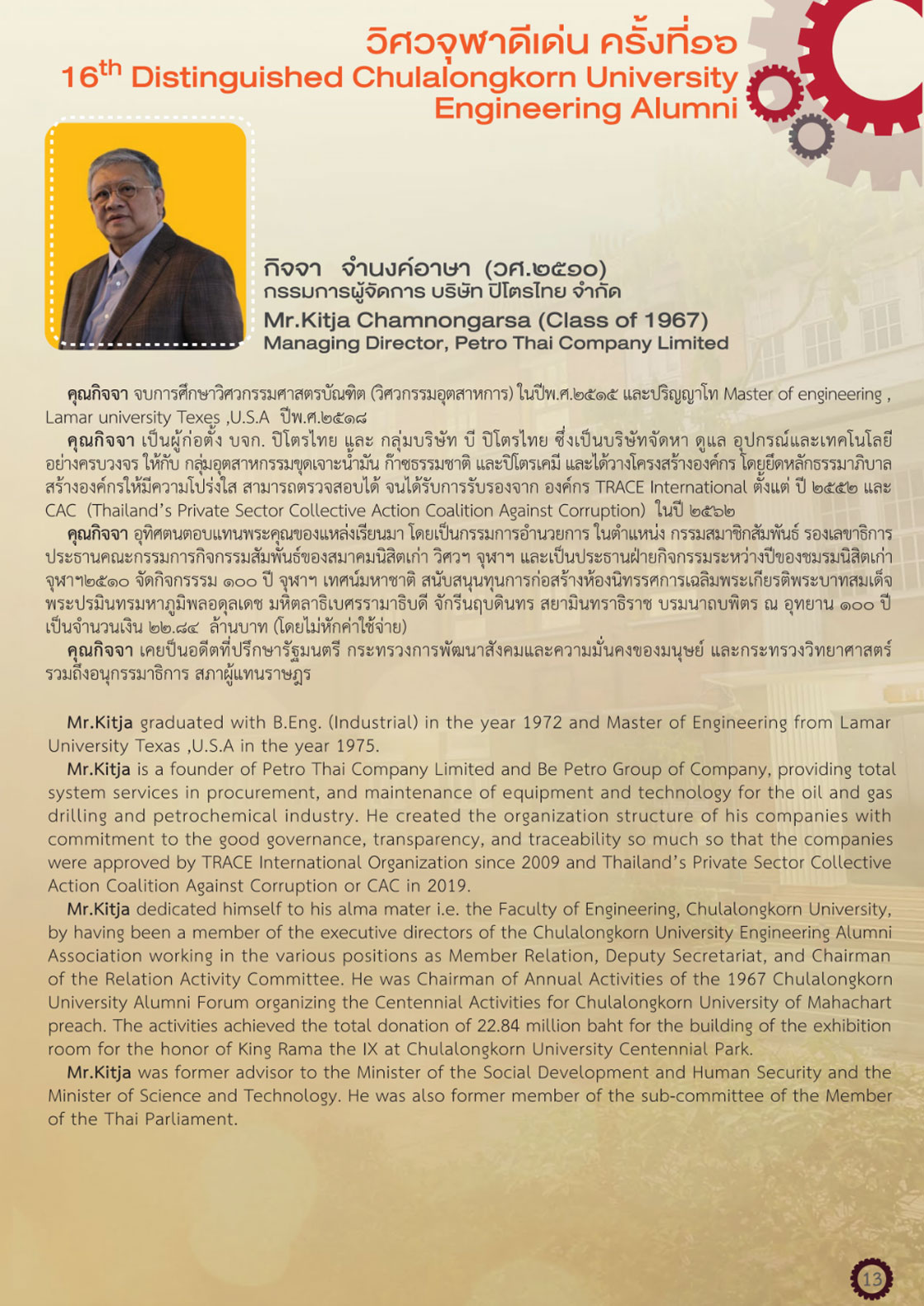Kitja Chamnongarsa, Founder of BE Petrothai Group, has been selected and awarded as a "Distinguished CU Engineering
