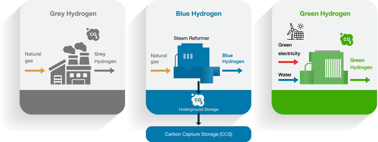 Blue Hydrogen : Similar to grey hydrogen but with carbon capture and storage (CCS) technology to reduce CO2 emissions.